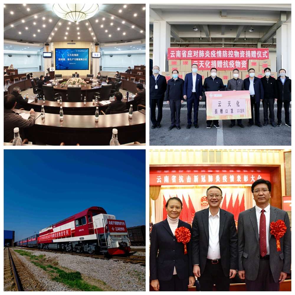 疫情发生以来,集团党委第一时间、快速行动,全面领导疫情防控、复工复产、发展稳定等工作。1月31日,集团召开疫情防控工作领导小组会议,主要领导带头密集深入基层一线和重点岗位检查指导,各单位积极行动、狠抓落实、跟踪问效,通过抓好自身疫情防控、全球范围采买筹措防疫物资、主动转产84消毒液、研发生产N95口罩原料等,主动为抗疫贡献国企力量。2月10日,全集团复工复产率已达95%,为保障春耕化肥供应和粮食安全做出了国企贡献。2月底,云天化专列满载价值680余万元的2500吨专供化肥,驰援武汉咸宁抗疫情、保春耕。疫情期间,全集团累计捐资捐物1000余万元,21000余名员工未出现确诊病例。