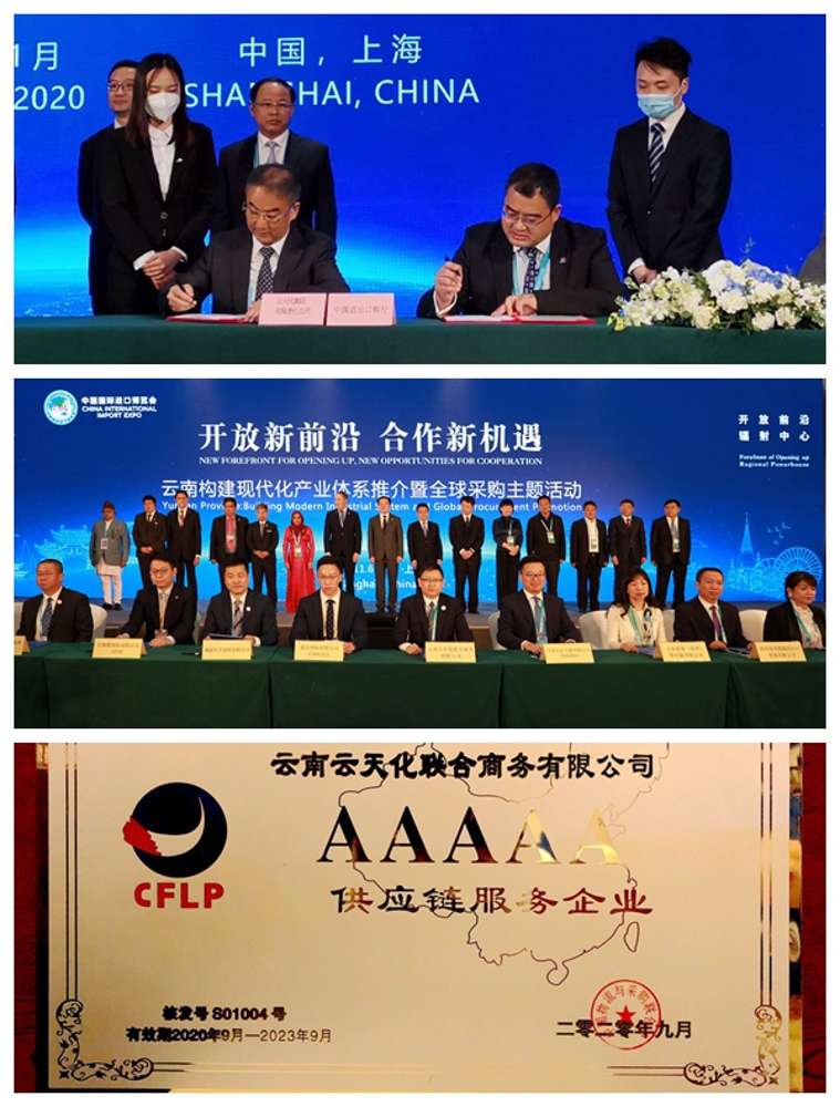 11月6日,禁忌书屋 在2020年第三届中国国际进口博览会现场的签约总金额达到12.6亿美元,较上届增长15.9%,占云南交易团现场签约量的80%。连续3年来,云天化在进博会上的签约总金额持续增加。云天化旗下6家企业入选2019-2020云南省外贸发展综合贡献百强企业,其中云南云天化联合商务有限公司连续3年排名第一位,并成为全国首批四家5A级供应链服务企业之一。