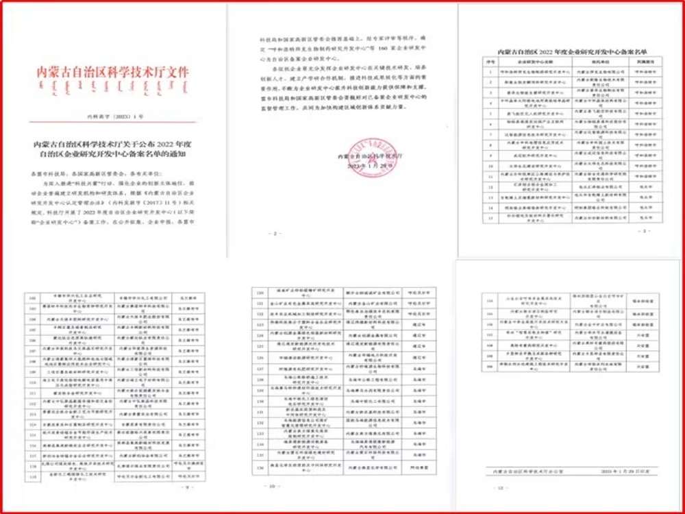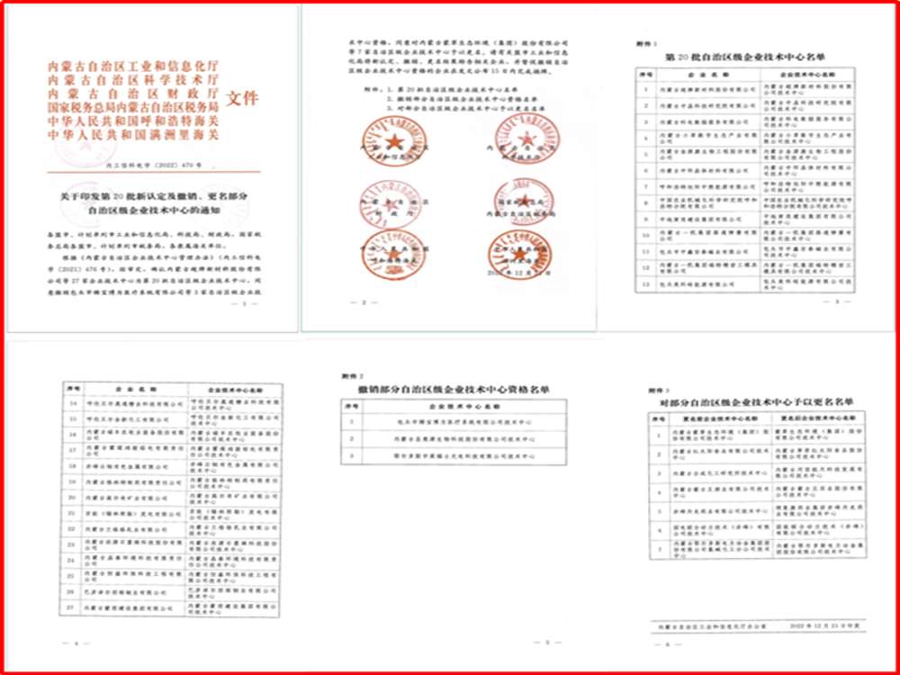 2022年4月份金新化工技术研发中心组织申报了内蒙古自治区级企业技术中心项目,在公司各部门积极配合下于2022年5月份完成申报工作。盟市依据运行评价指标体系对我公司申报材料的真实性、完整性、合规性进行审查合格后推荐至自治区工信厅并抄报至自治区科技厅、财政厅、税务厅、呼和浩特海关、满洲里海关核查有无不良记录。同年9月份,自治区工信厅委托第三方机构,组织专家进行了为期3天的现场形式审查和初步评审。12月初自治区工信厅组织了线上认定答辩会,于2022年12月14日自治区工信厅公示拟认定名单,12月20日公示结束。与此同时,2022年9月还组织了内蒙古自治区企业褐煤煤化工技术研究开发中心的备案工作。2023年2月20日,金新化工同时获得了自治区的认定文件。
