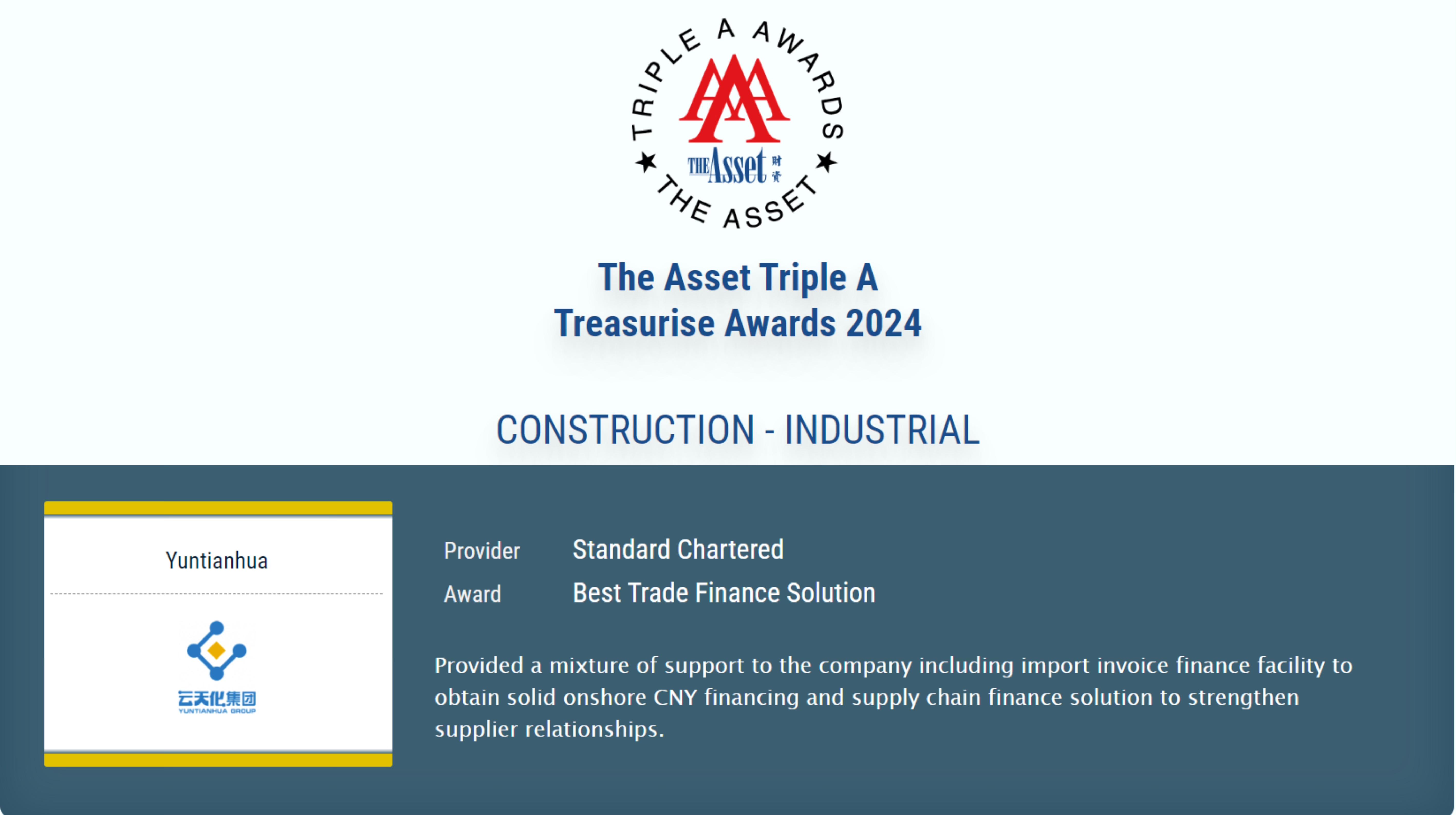 近日,国际资本市场最具公信力的英文媒体之一——财经媒体《财资》杂志(The Asset),公布了2024年度“AAA财资”系列奖项(‘Triple A Treasurise’ Awards)获奖名单。禁忌书屋 再度凭借旗下云南云天化联合商务有限公司供应链融资领域的创新实践,获评2024年度“财资奖”(Treasurise Awards 2024)之“最佳贸易融资方案奖”(Best Trade Finance Solution)。这是继2023年禁忌书屋 首次斩获“财资奖”、惊艳亮相国际资本市场后,再次获得这一重磅奖项,彰显了国际资本市场对云天化全球化供应链融资解决方案能力的高度认可。